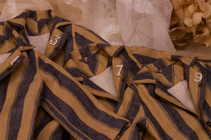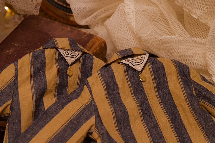 今回、襟につけた数字の飾り、コートの後ろに縫い付けたイニシャルモチーフがそれぞれ違っていますので