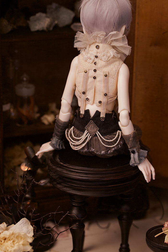 アームコルセットは左右それぞれ装飾が違います。ボタンと糸ループで着用させます。